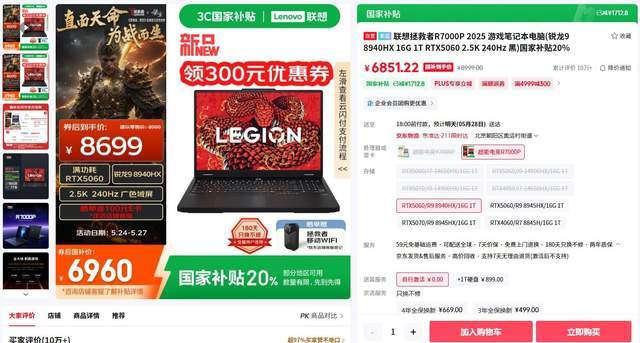 2025款的拯救者R7000P升级搭载了NVIDIA GeForce RTX 5060笔记本电脑GPU,与AMD锐龙9 8940HX处理器搭配,可以为玩家带来极为出色的游戏体验。再加上16GB DDR5 5200高速内存与1TB PCIe4.0固态硬盘的标配,不用折腾也能获得足够好的综合体验。这套配置的拯救者R7000P原价8999元,国补之后价格来到6960元,尽早购买的话还可通过晒单评价获得100元京东E卡,再加上京东PLUS会员之类的补贴,笔者实测到手价6851.22元。