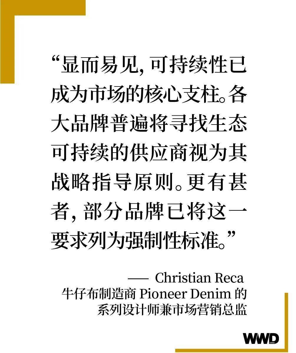 牛仔布制造商 Pioneer Denim 的系列设计师兼市场营销总监 Christian Reca 强调:“显而易见,可持续性已成为市场的核心支柱。各大品牌普遍将寻找生态可持续的供应商视为其战略指导原则。更有甚者,部分品牌已将这一要求列为强制性标准。”