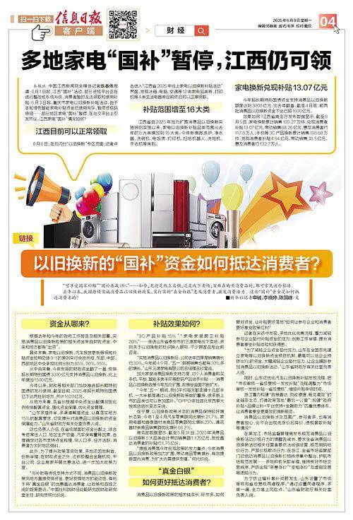 本报讯 中国江西新闻网全媒体记者陈春伟报道:6月1日起,江苏“国补”活动,部分资格平台正在进行整改或系统升级,消费者暂时无法领取和使用补贴;6月3日起,重庆市家电以旧换新补贴活动,由于本轮绿色智能家电补贴资金已使用完毕,暂停资格码申领……部分地区家电“国补”暂停,在社交平台上引发热议。江西家电“国补”情况如何?