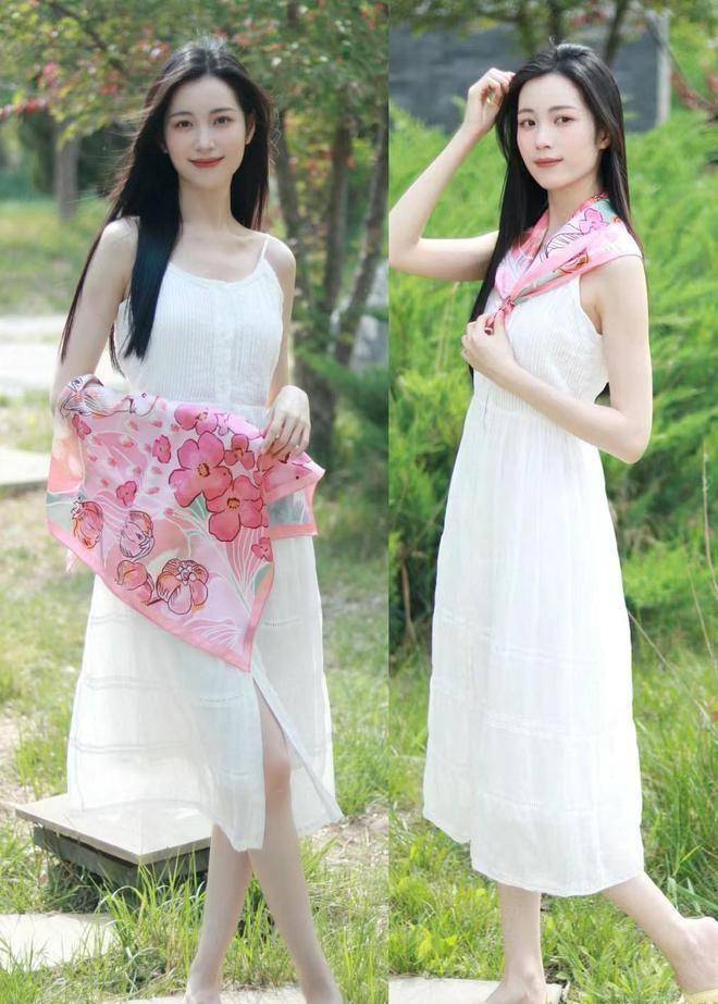 而图中这位时尚博主的穿搭中,就因为白色连衣裙的使用,在视觉上创造出了充足的留白感,因此即使加入艳丽感十足的丝巾,也不会显得很突兀。