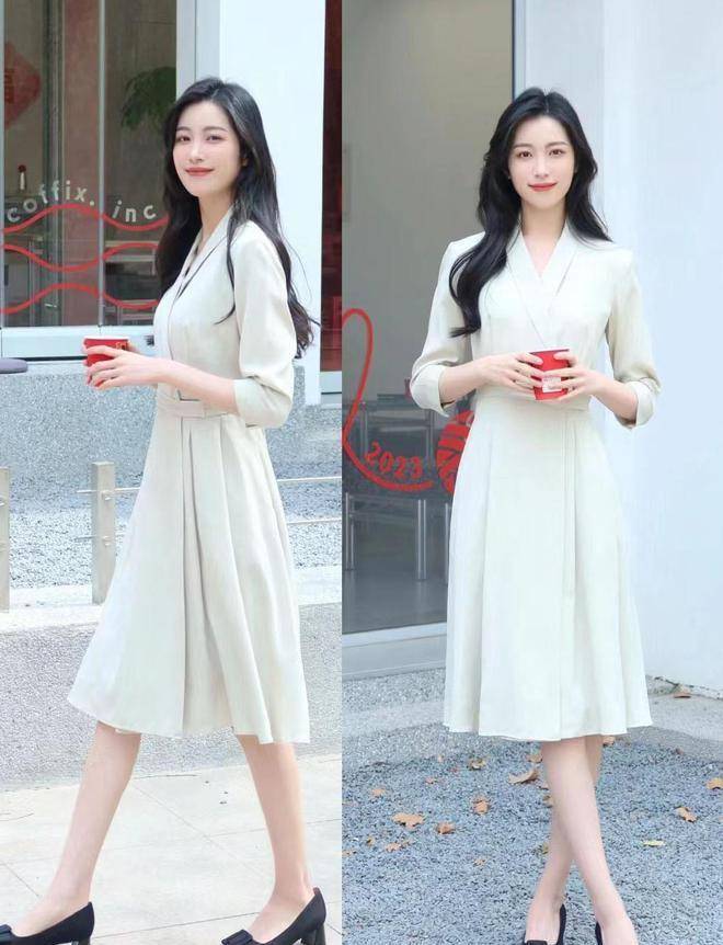 这件西装连衣裙也是如此,有着比较明显的掐腰设计,但是如果觉得这种塑造感不够突出的话,其实也可以试着配合与服装色调不同的腰带,更为直观的塑造出修长比例。