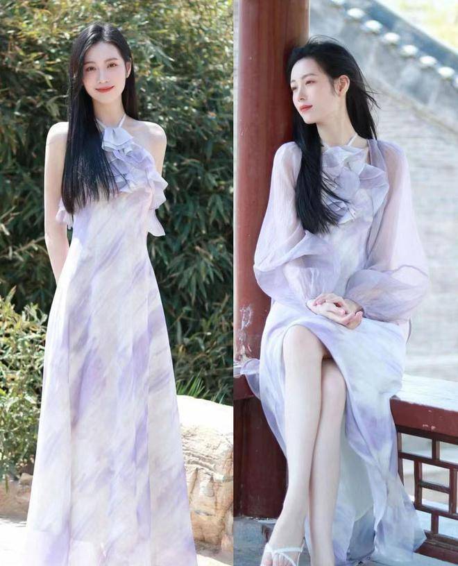 例如图中这款挂脖设计的连衣裙,就是运用了浅紫色,同时配合着飘逸感十足的雪纺面料,可以轻松衬托出女神感十足的一面。