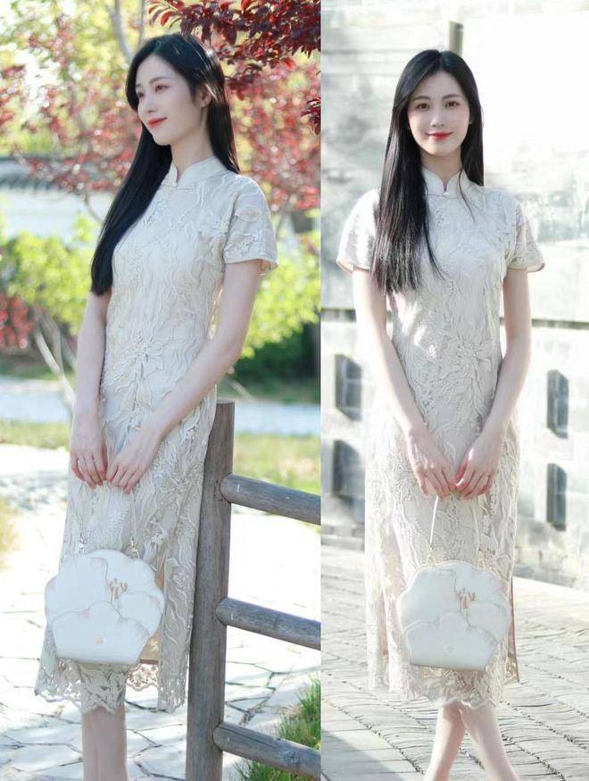 例如这身穿搭中采用的旗袍长裙,本身就是温婉秀丽感的最佳体现,如果在表面同时加入蕾丝设计的话,那么也能增添几分甜美精致的气息。