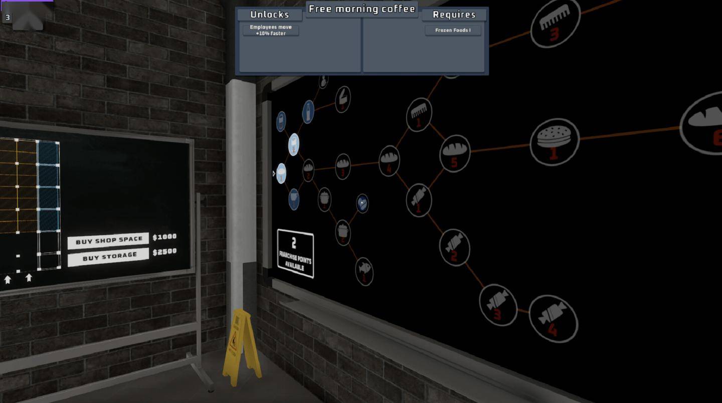 拥有一家成功的超市可获得特许经营积分:使用这些积分在技能黑板上取得进步,并为您的业务增加更多优势,例如解锁产品或提高员工绩效。