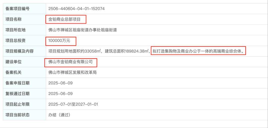 6月10日,广东省投资项目在线审批监管平台披露,金铂商业总部项目在佛山市祖庙街道已备案,计划于祖庙街道投资10亿元打造高端商业综合体。