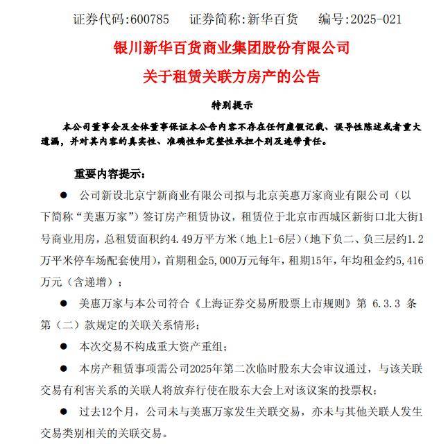 6月11日,新华百货公布,公司新设北京宁新商业有限公司拟与北京美惠万家商业有限公司(简称“美惠万家”)签订房产租赁协议,租赁位于北京市西城区新街口北大街1号商业用房,总租赁面积约4.49万平方米(地上1-6层)(地下负二、负三层约1.2万平米停车场配套使用),首期租金5,000万元每年,租期15年,年均租金约5,416万元(含递增)。