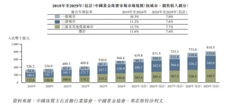 在全球经济不确定性加剧背景下,黄金作为避险资产需求上升,2024年金价同比上涨超20%,推动黄金珠宝消费增长。年轻化与个性化需求,Z世代成为消费主力,公司通过IP联名(如与迪士尼合作)和时尚设计(如“守护の光”系列)吸引年轻客群,2024年30岁以下消费者占比达45%。一线城市预计将保持稳固增长,复合年增长率为7.0%。中国各线城市的不同增长表明黄金珠宝市场充满机会,尤其是在三线及其他低线城市以及二线城市,这将促进未来的市场扩张。