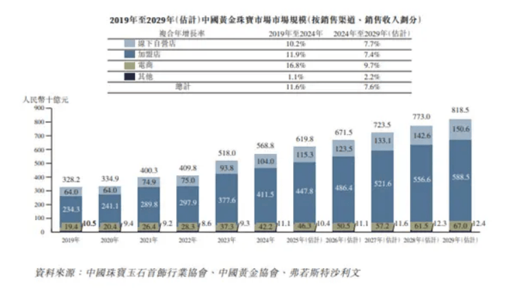 中国黄金珠宝市场呈现波动式增长,由2019年的人民币3,282亿元增至2024年的人民币5,688亿元,复合年增长率为11.6%。值得注意的是,在2024年,加盟店在黄金珠宝市场中份额最大,占比72.3%。然而,增长最快的是电商渠道,该渠道在此期间复合年增长率最高,达到16.8%,凸显了向数字化的加速转变以及消费者对在线购物便利性的日益偏好。预计市场将继续增长,到2029年将达到人民币8,185亿元,2024年至2029年的复合年增长率为7.6%。