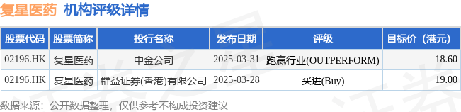 截至2025年6月24日收盘,复星医药(02196.HK)报收于16.36港元,上涨2.76%,成交量783.62万股,成交额1.27亿港元。投行对该股的评级以跑赢行业(OUTPERFORM)为主,近90天内共有1家投行给出跑赢行业(OUTPERFORM)评级,近90天的目标均价为18.8港元。中金公司最新一份研报给予复星医药跑赢行业(OUTPERFORM)评级,目标价18.6港元。