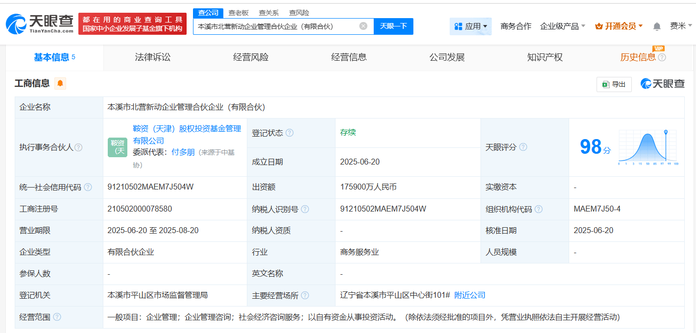 每经AI快讯,天眼查App显示,近日,本溪市北营新动企业管理合伙企业(有限合伙)成立,执行事务合伙人为鞍资(天津)股权投资基金管理有限公司,出资额17.59亿元人民币,经营范围为企业管理、企业管理咨询、社会经济咨询服务、以自有资金从事投资活动。股权全景穿透图显示,该合伙企业由鞍钢集团旗下鞍资(天津)股权投资基金管理有限公司、本钢集团旗下本溪北营钢铁(集团)股份有限公司、金泰产融(北京)创业投资基金管理有限公司共同出资。