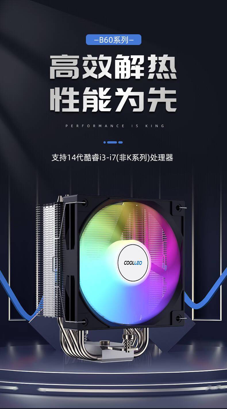 B60 风冷散热器兼容英特尔 LGA 1851 / 1700 / 1200 / 115X 和 AMD AM5 / AM4 平台,标称解热能力 245W,酷里奥宣称其支持英特尔第 14 代酷睿 i3~i7 的 non-K 锁频版 CPU。