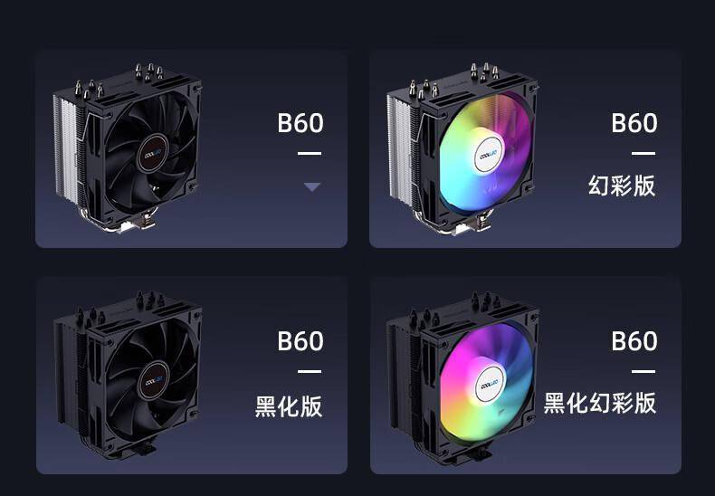 酷里奥 B60 风冷包含四个版本,其中标准版售 129 元,配备 ARGB 风扇的幻彩版 139 元、热管、鳍片、底座黑化处理版 149 元,黑化幻彩版 149 元。