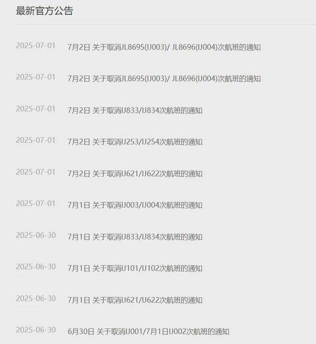 今日,记者在春秋航空官网发现,6月30日、7月1日、2日春秋航空日本累计18个班次航班被取消,包括IJ001次航班由东京(成田)飞往上海(浦东)、IJ002次航班由上海(浦东)飞往东京(成田)等,取消原因均是“因受运力调配影响”。