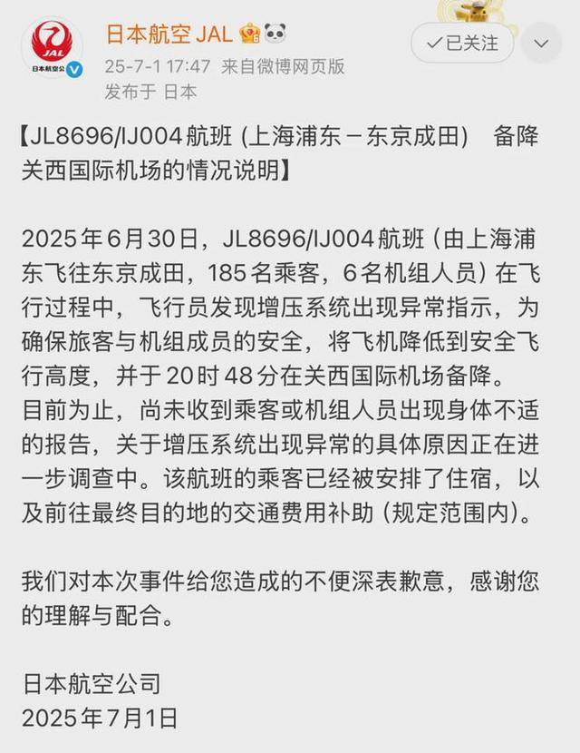 今日下午,日本航空JAL发布情况说明,回应上海至东京航班备降。情况说明中指出,2025年6月30日,JL8696/IJ004航班(由上海浦东飞往东京成田,185名乘客,6名机组人员)在飞行过程中,飞行员发现增压系统出现异常指示,为确保旅客与机组成员的安全,将飞机降低到安全飞行高度,并于20时48分在关西国际机场备降。