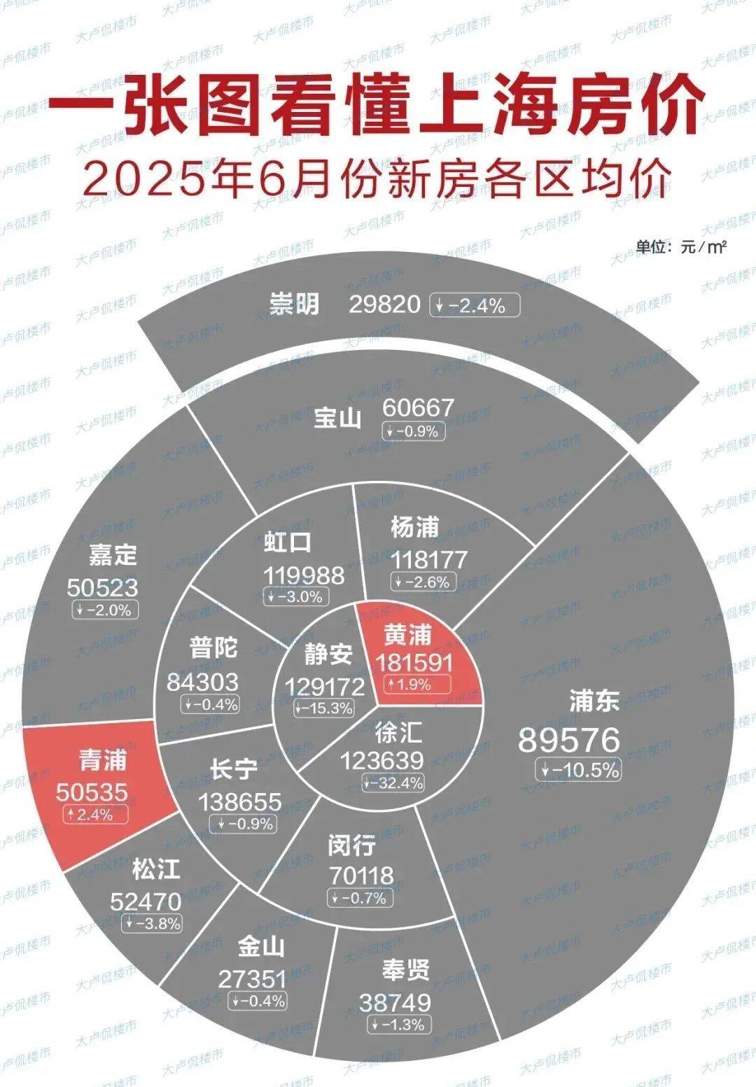 6月上海各区新房网签均价出炉,16个区中仅有2区上涨,分别是黄浦涨1.9%、青浦涨2.4%,降幅较大的是徐汇和静安。