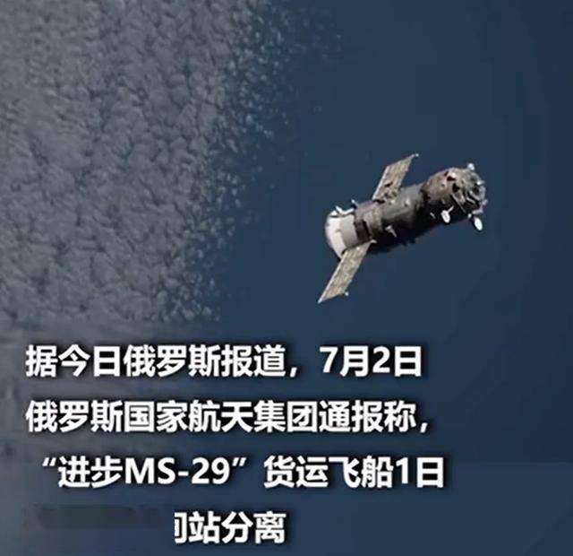2024年11月21,俄罗斯发射了“进步MS-29”货运飞船,为国际空间站送去了2000多公斤货物,其中包括一些推进剂。至今这艘飞船已经在轨飞行了7个多月时间,在7月2日,俄罗斯国家航天集团网站发布消息称,“进步MS-29”货运飞船从国际空间站俄罗斯舱段“探索”号实验舱撤离,还公布了这艘飞船从空间站撤离后单独飞行的画面,最后这艘货运飞船再入大气层后坠落到太平洋南部。