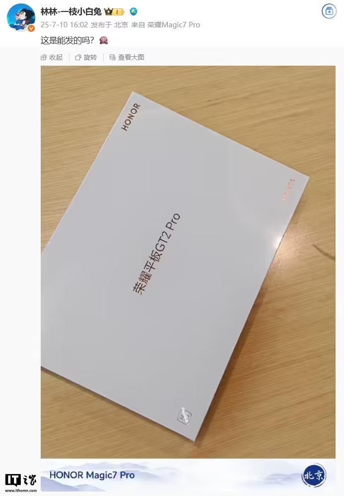 7 月 10 日消息,荣耀中国区副总裁、智慧生活业务部部长林林今日在微博透露了一款平板新品 —— 荣耀平板 GT2 Pro,预计将在近期发布。