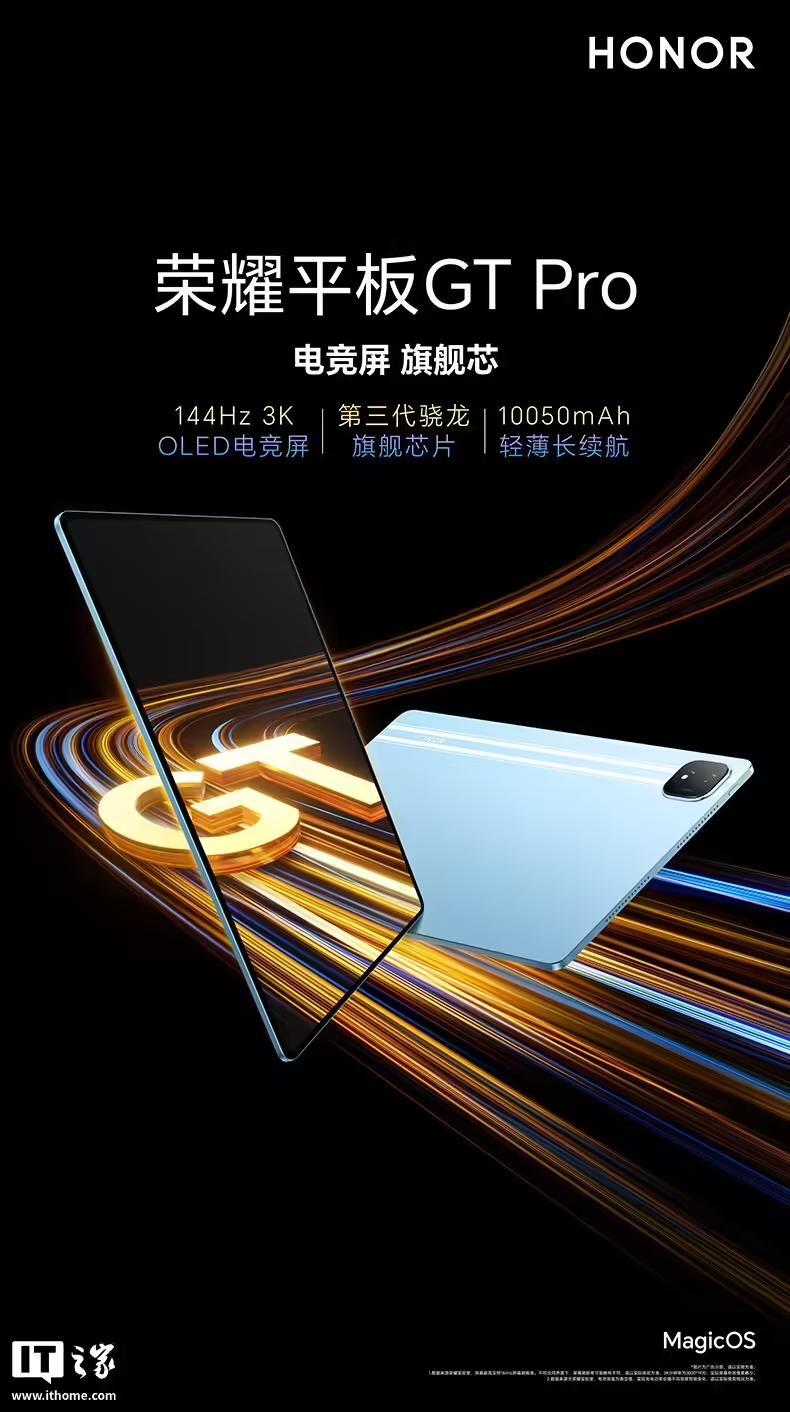 作为参考,荣耀去年 10 月发布了荣耀平板 GT Pro,其搭载骁龙 8s Gen3 处理器、配备 12.3 英寸 144Hz 3K(3000×1920) OLED 屏幕,官方售价 2499 元起。附主要参数如下: