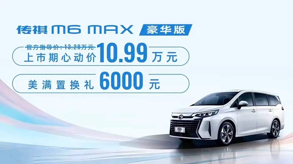 7月12日,广汽传祺M6 MAX豪华版正式上市, 新车官方指导价13.28万元,上市期心动价10.99万元,置换补贴6000元。 新款车型在现款传祺PRO豪华版基础上,对外观造型、内饰质感、便携性配置等进行升级。