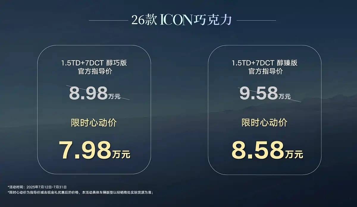 7月12日,笔者从吉利汽车官方获悉,2026款吉利ICON现已正式上市,共推出2款车型,指导价8.98万-9.58万元,限时心动价7.98万-8.58万元。作为改款车型,2026款吉利ICON的外观及内饰设计有所调整,引入Flyme Auto系统,购买门槛相比2025款吉利ICON(指导价:9.69万元起)进一步下调。