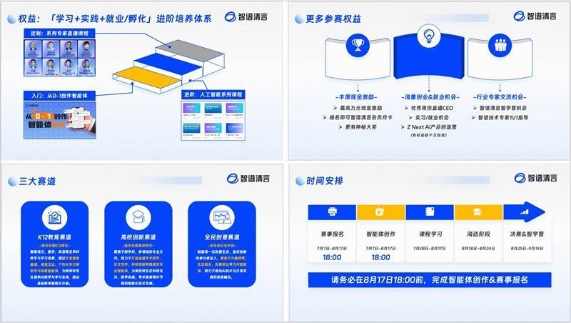 进入决赛的选手将获得智谱AI技术专家的一对一指导,并受邀参加智谱清言举办的“智学营”,优秀选手还有机会获得就业推荐,优胜者将获得最高1万元现金奖励,并有机会加入“Z Next AI产品创造营”,争取潜在投资和商业孵化机会。