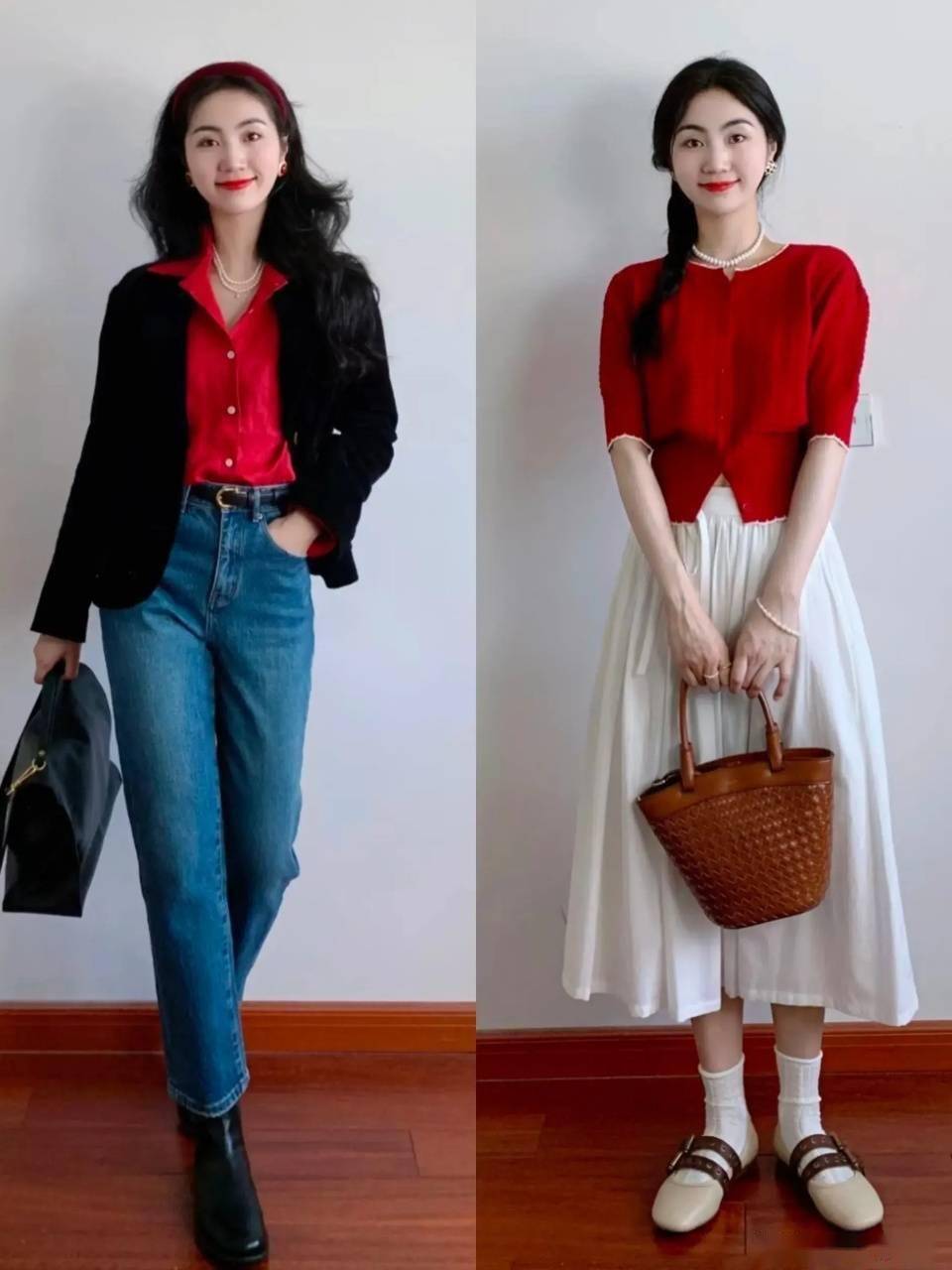 复古又亮眼的大红色,与秋冬的适配度很高,若是喜欢显白气质一点的打扮,可以利用50%+50%的搭配法则,或者利用红色进行小面积点缀,也是好看的。