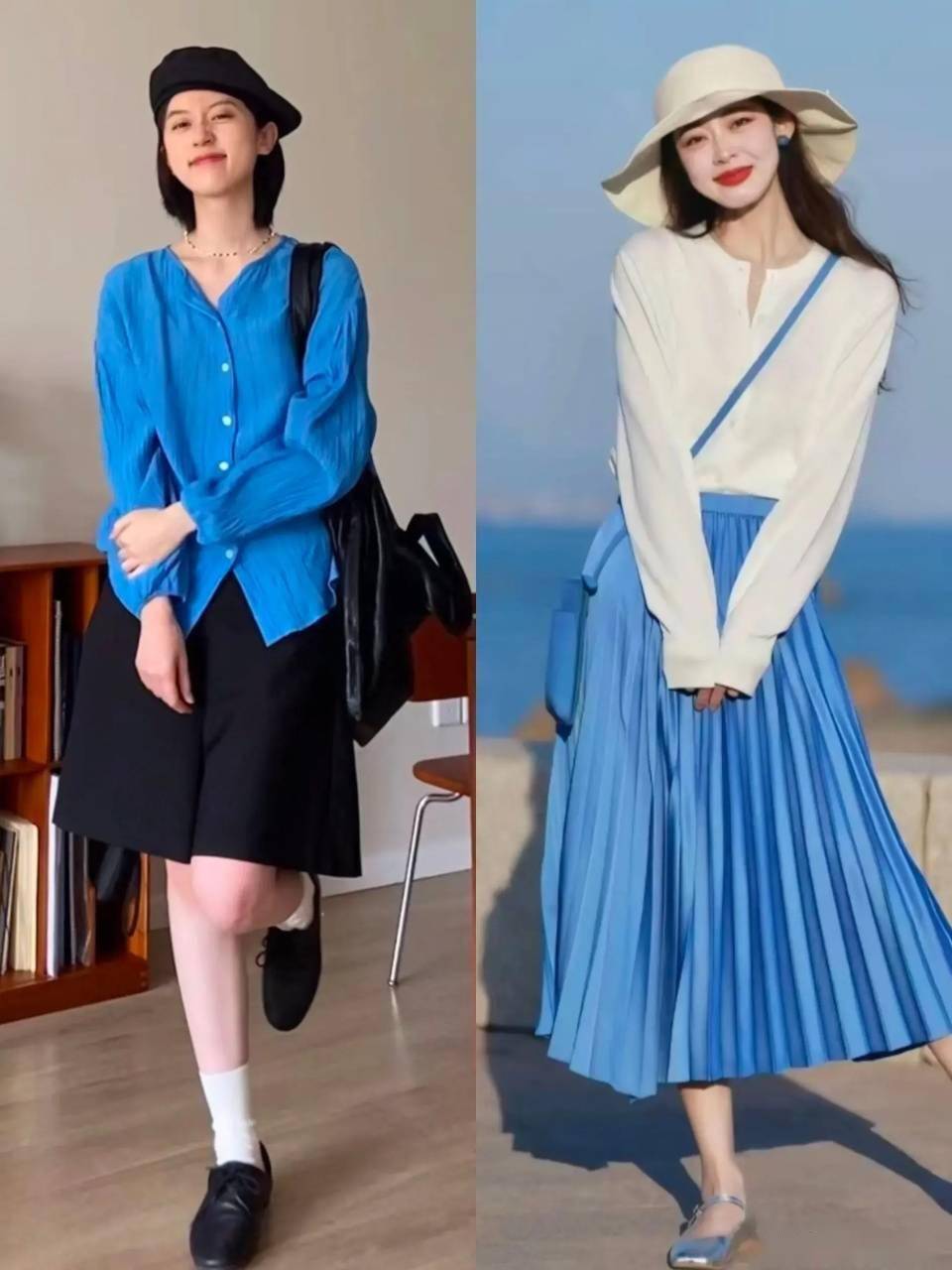 白色+蓝色,温柔有气质,黑色+蓝色,显白有气质,蓝色的色调有很多,浅蓝色适合春夏,克莱因蓝适合秋冬,搭配起来简单高级,显白温柔。
