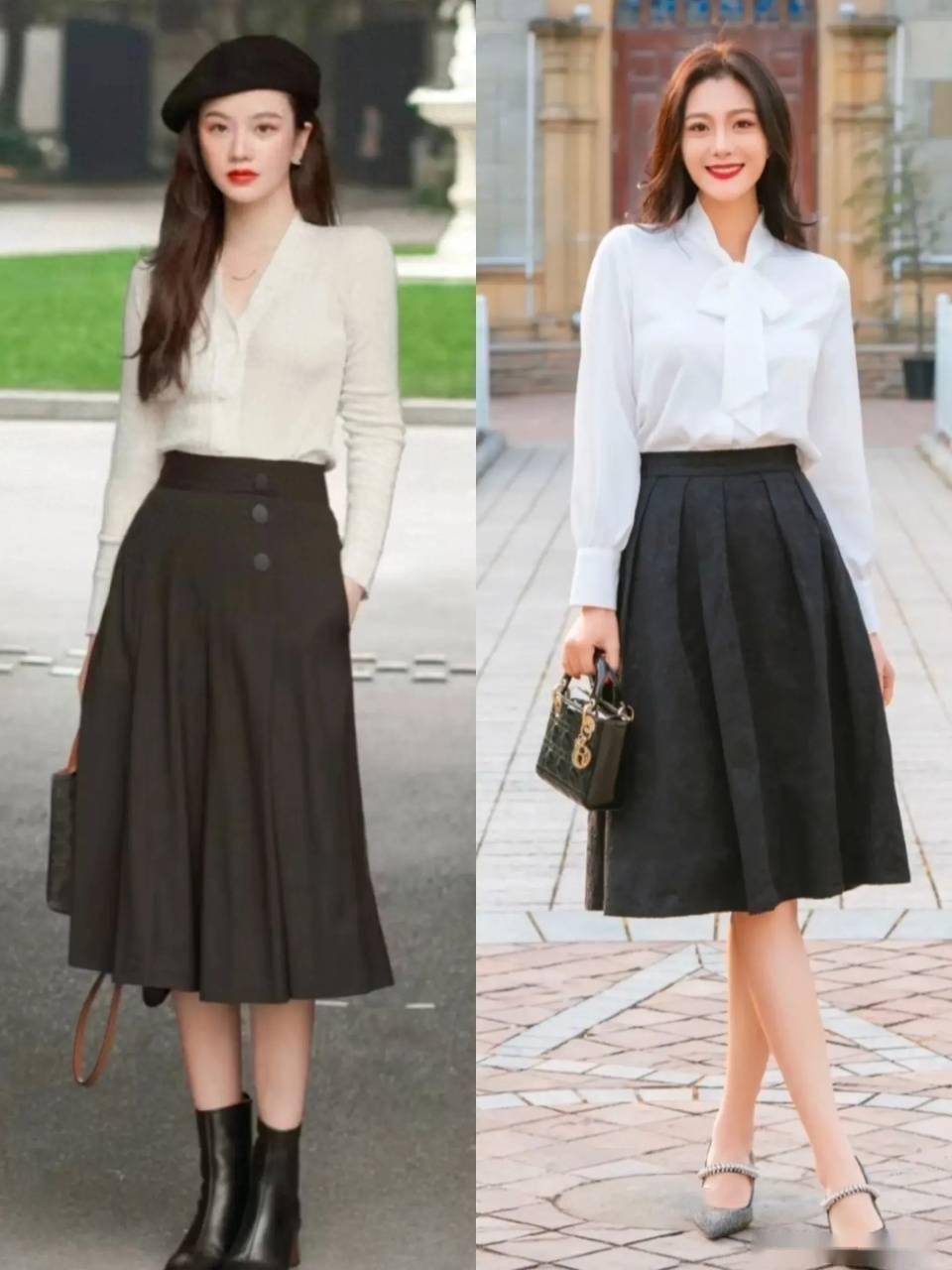在黑白穿搭中,可以运用点缀法则,选择一件气质的丝巾搭配白衬衫,作为整体造型的亮点,鞋子颜色要和裙子呼应,看起来才会更优雅高级,适合通勤上班。