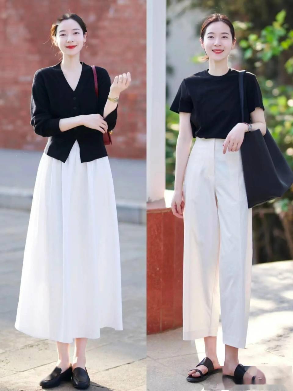 最经典的黑白配,简约而不失时尚感,在搭配时,可以遵循“上黑下白”或“上白下黑”的原则,使整体造型更加和谐。