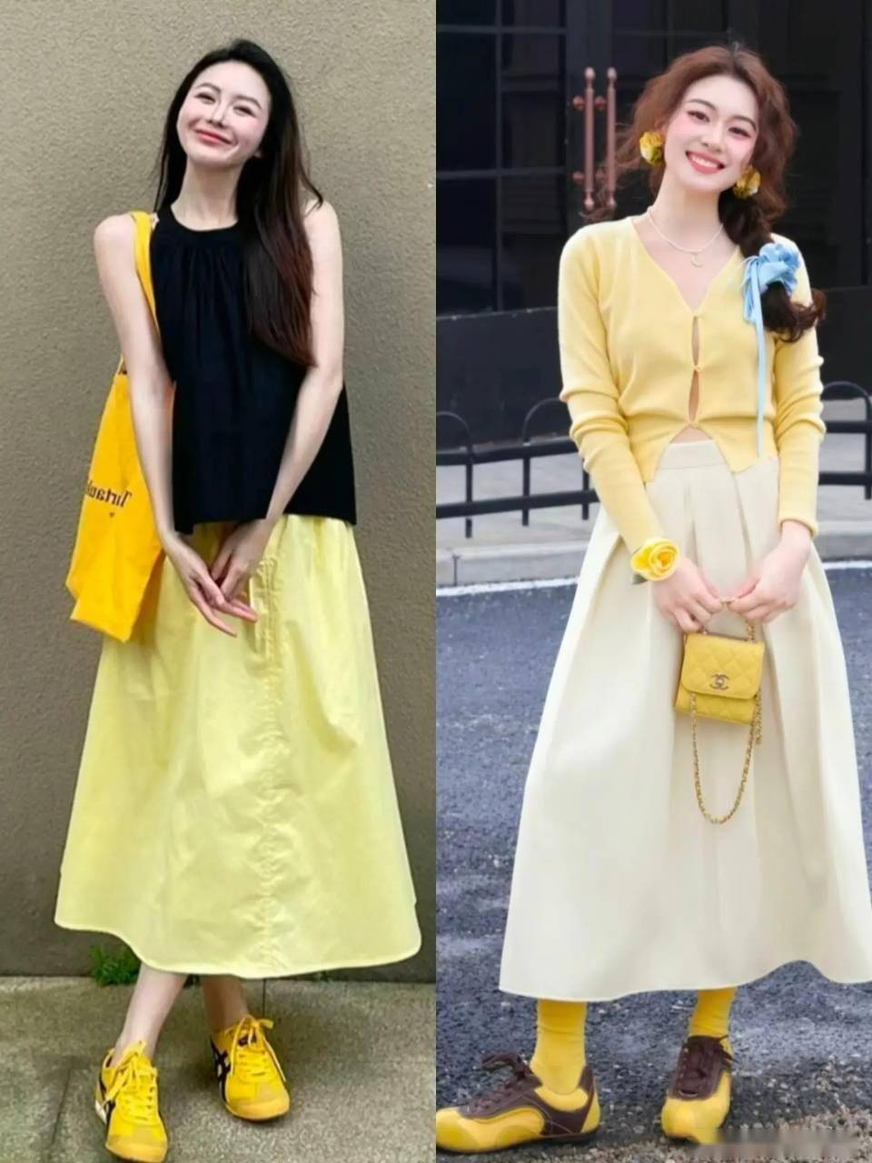 黑白色与黄色的搭配完全是两种截然不同的风格,白色+黄色,温柔显白,很有女人味,若是换成黑色,视觉上会更偏气质一些,可以根据自己的喜欢来进行搭配。