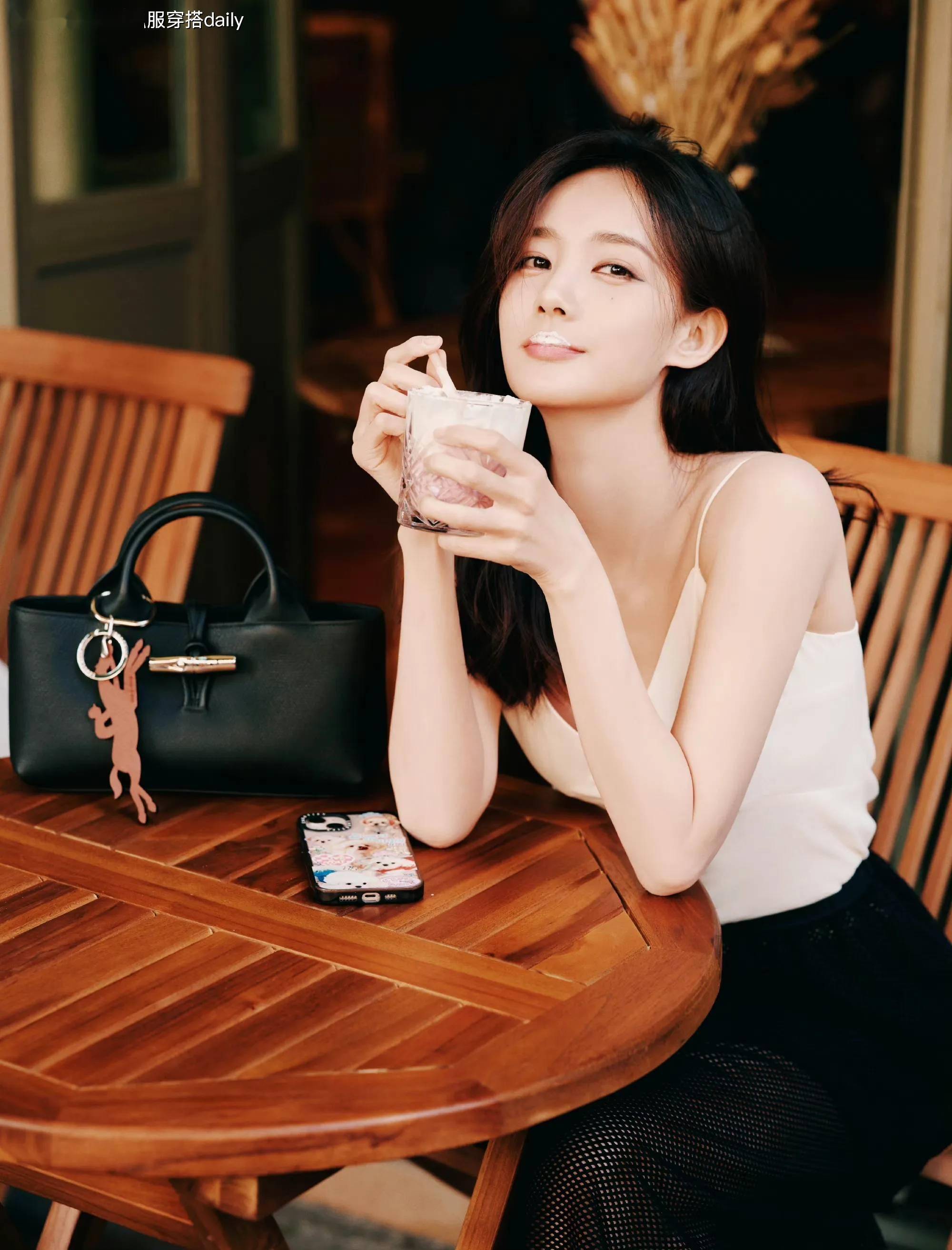 李一桐身穿白色吊带衫,极为简约的颜色和极为简单的款式,都极大的突出了她精致的五官,和姣好的面庞!不得不说,光影交错之间,她美的就像是电影画报里的女主角!