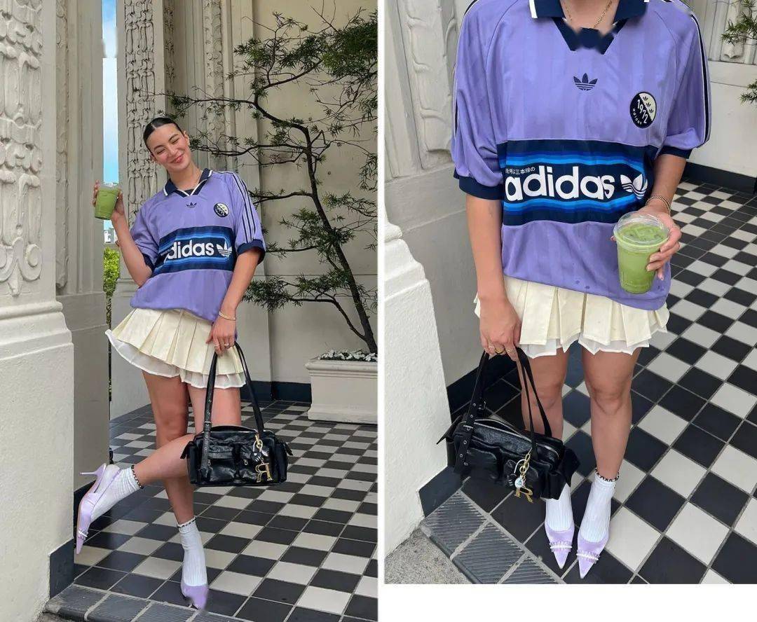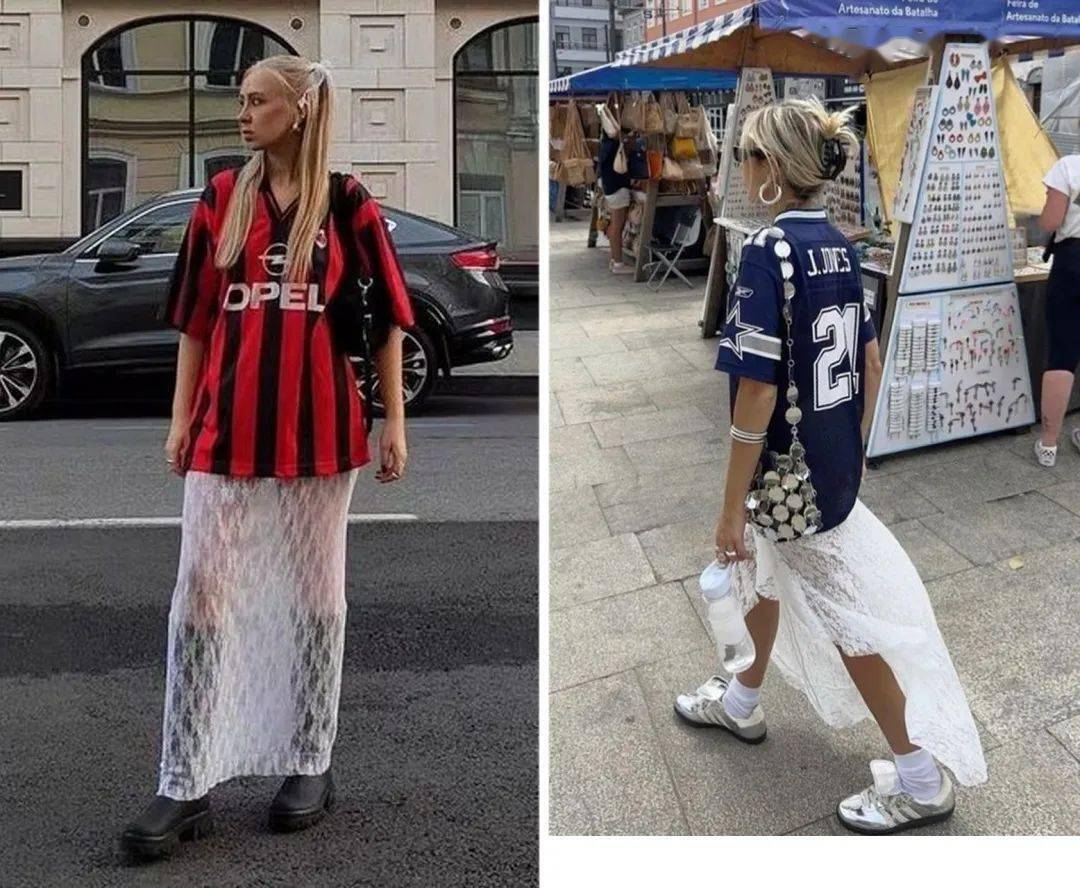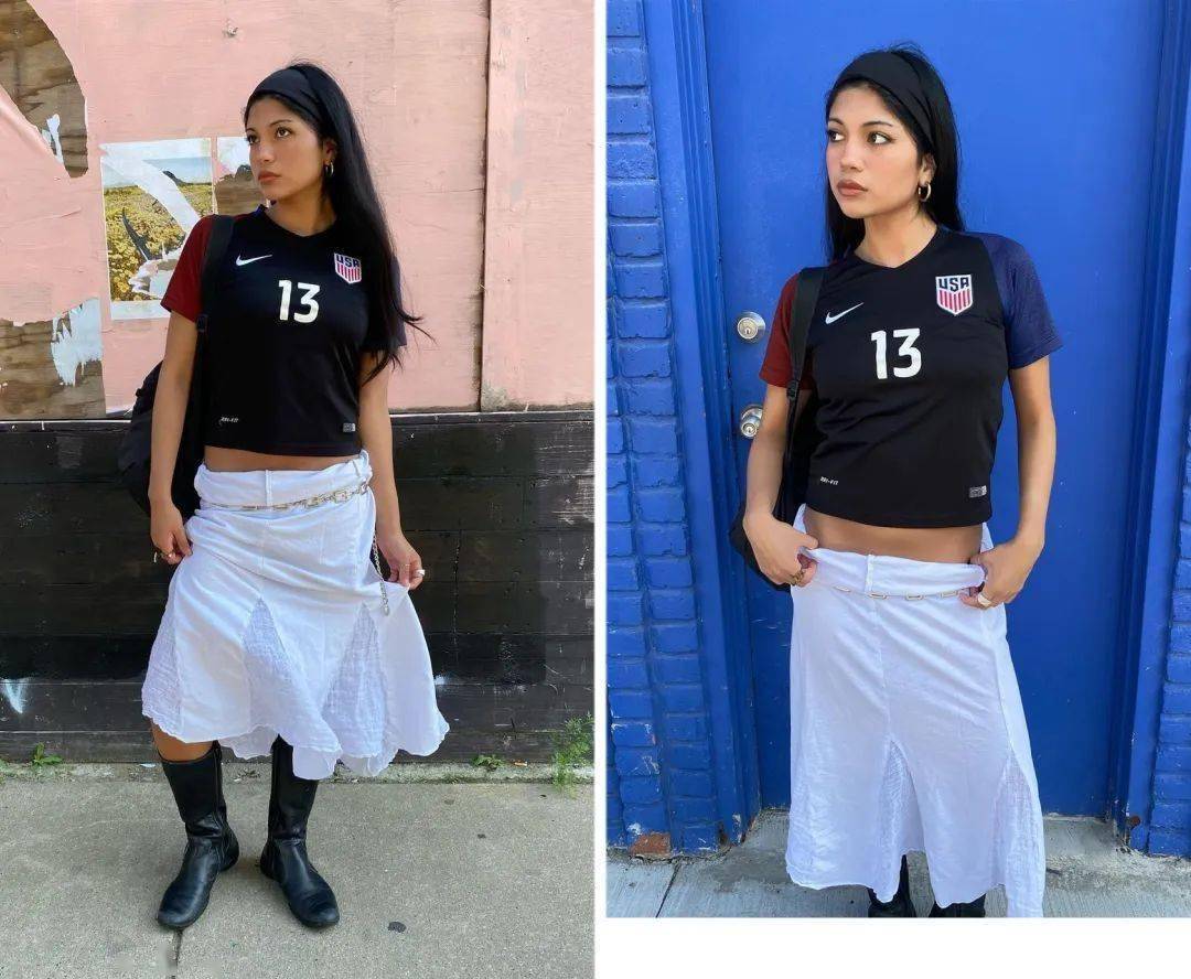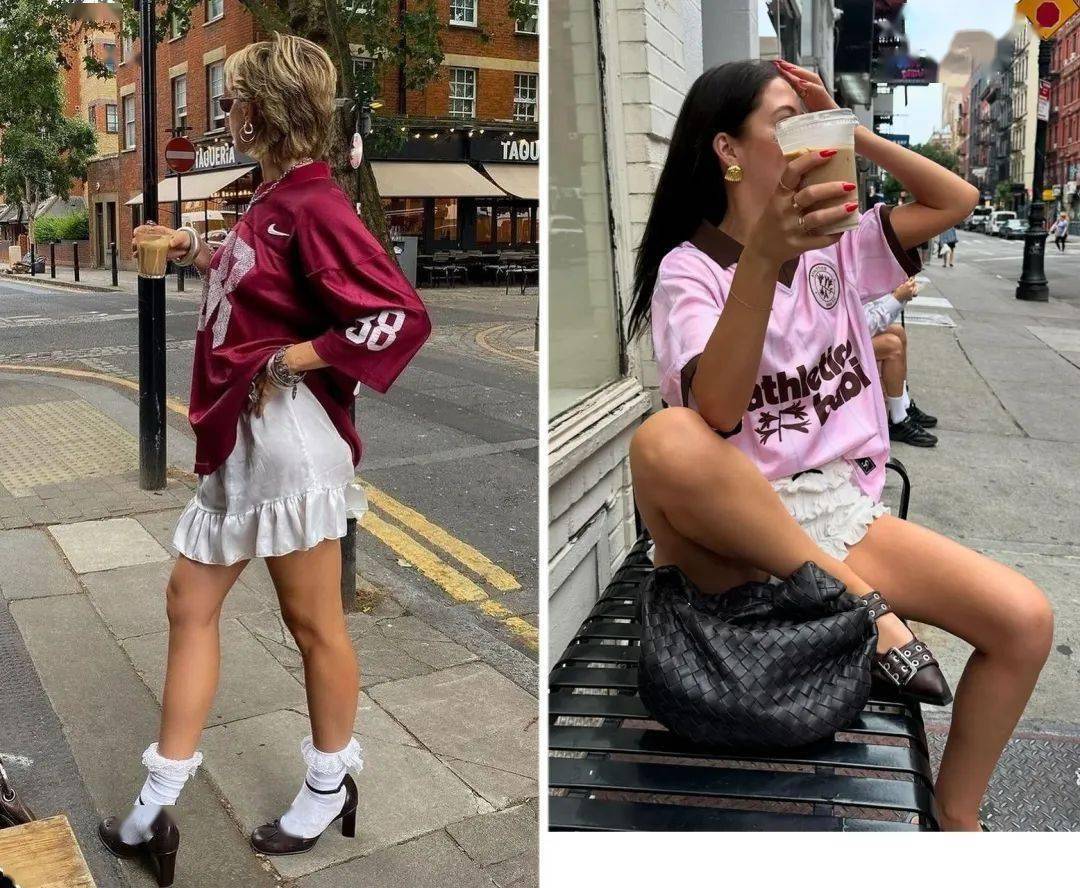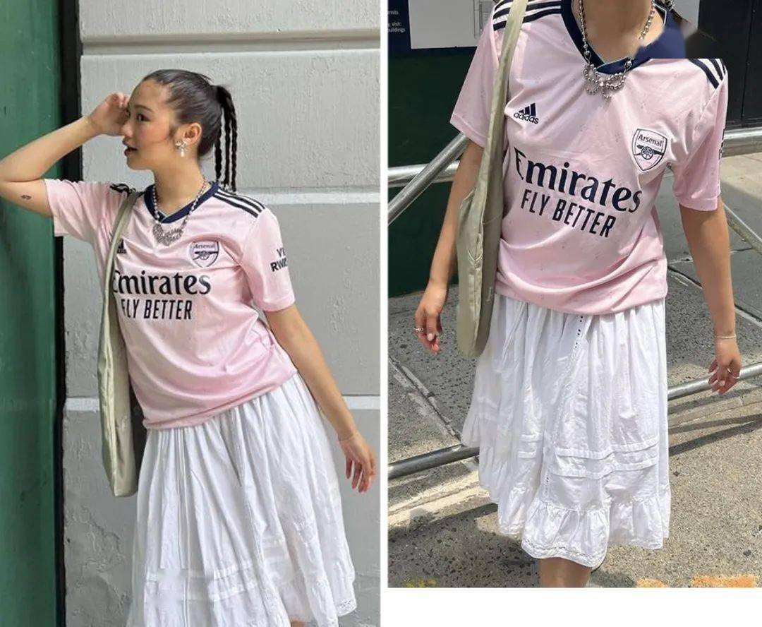 搭配的精髓就在于利用可爱甜美的单品来中和球衣的“男性化”。