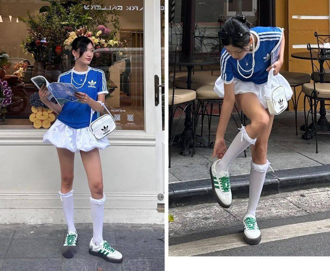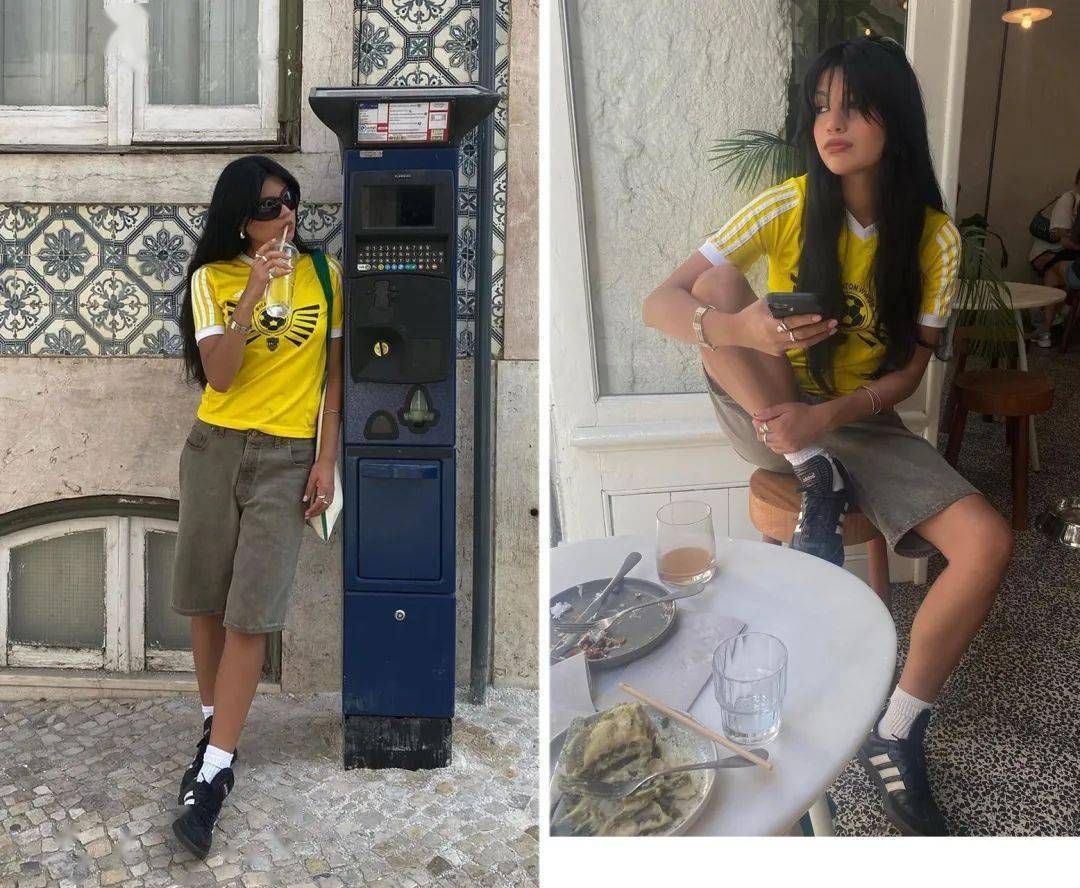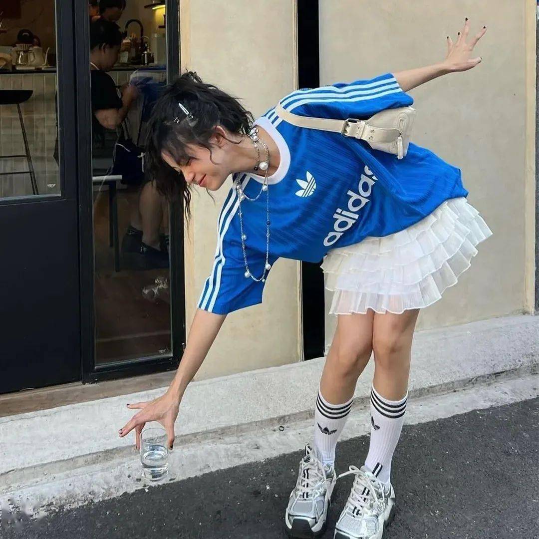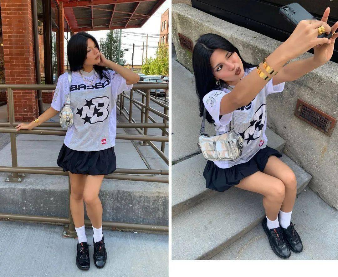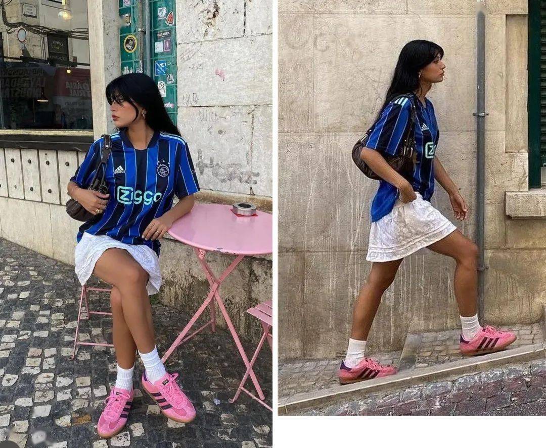 搭配的精髓就在于利用可爱甜美的单品来中和球衣的“男性化”。