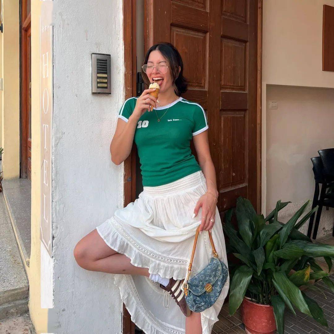 不知道你们发现没有,今年用长裙来搭稍微修身一点的T恤也特别时髦。