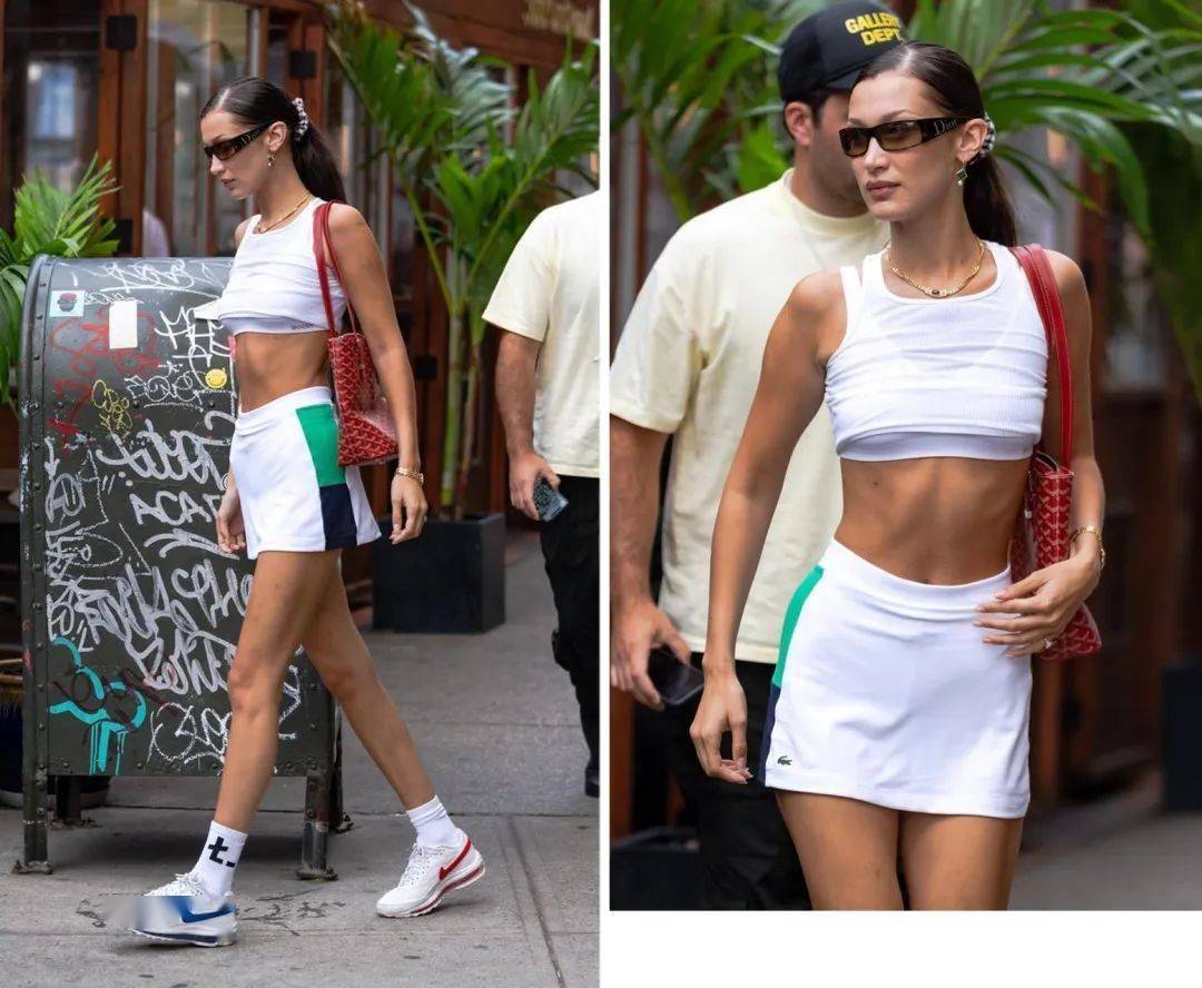 Bella之前的一套网球风街拍就很出圈啊!红绿小面积的撞色也太好看了吧?