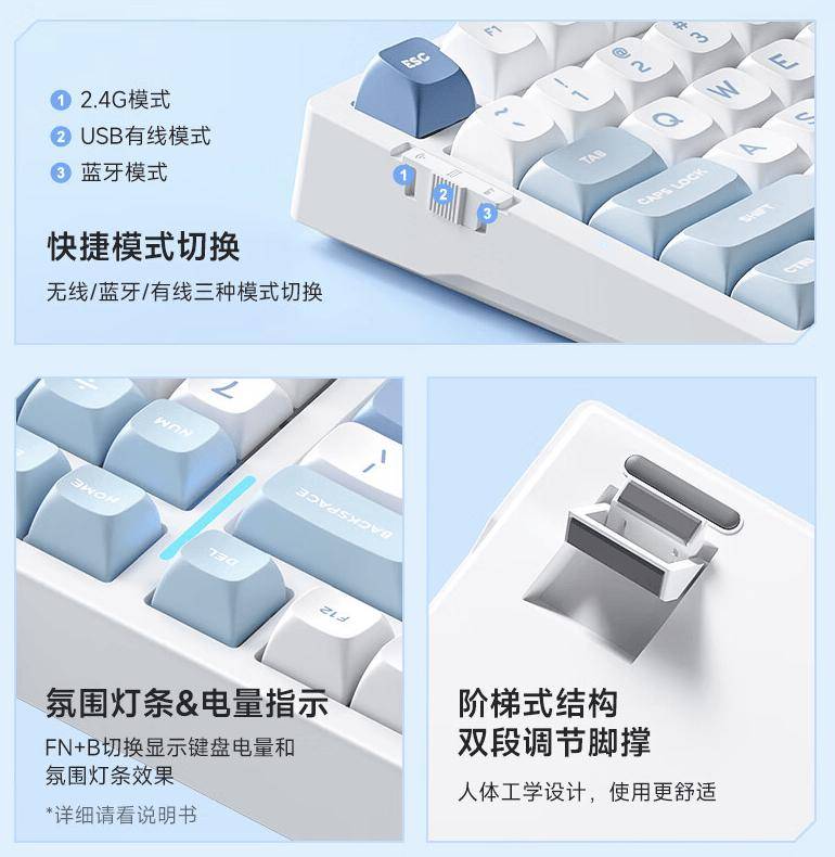 据介绍,系列机械键盘拥有 1600万色RGB灯效,具备电量指示“氛围灯条”,使用五层消音填充、双色PBT键帽,支持全键热插拔,可选白菜豆腐轴 V2、烈焰橙轴、雪虎轴三款轴体。