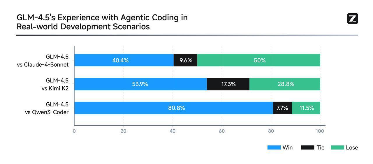 为了证明 GLM-4.5 在真实场景 Agent Coding 中的实力,智谱干脆直接接入了 Claude Code,与 Claude-4-Sonnet、Kimi-K2、Qwen3-Coder 等模型一较高下。