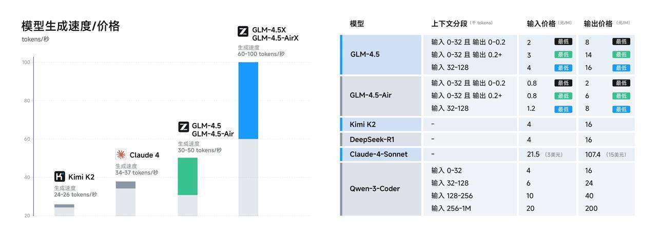 此外,GLM-4.5 在成本和效率上的突破可能更具杀伤力。API 调用价格低至输入 0.8 元/百万 tokens,输出 2 元/百万 tokens,同时,高速版本实测生成速度最高可至 100 tokens/秒,支持低延迟、高并发的实际部署需求,真价格屠夫。