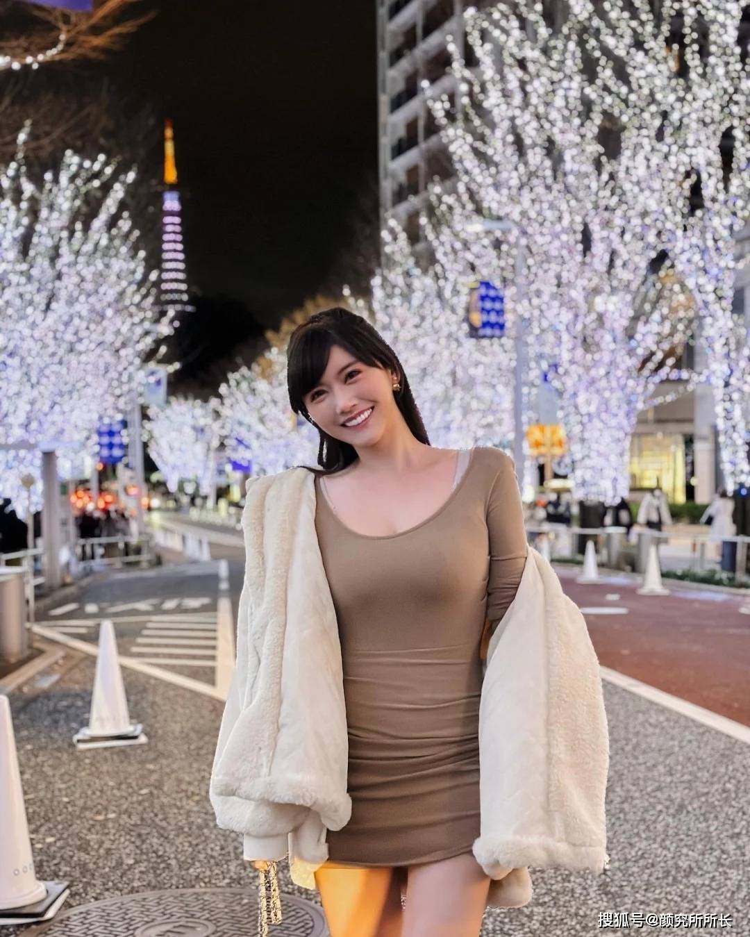 背景中,夜晚的街道和高楼大厦被灯光点亮,人群熙熙攘攘,营造出一种热闹而又温馨的氛围。这样的背景不仅为照片增添了几分节日的喜庆感,也让人感受到了这座城市的活力与魅力。在这样的背景下,时尚博主的每一步都显得格外自信与从容,仿佛她本身就是这个城市中最亮丽的风景线。