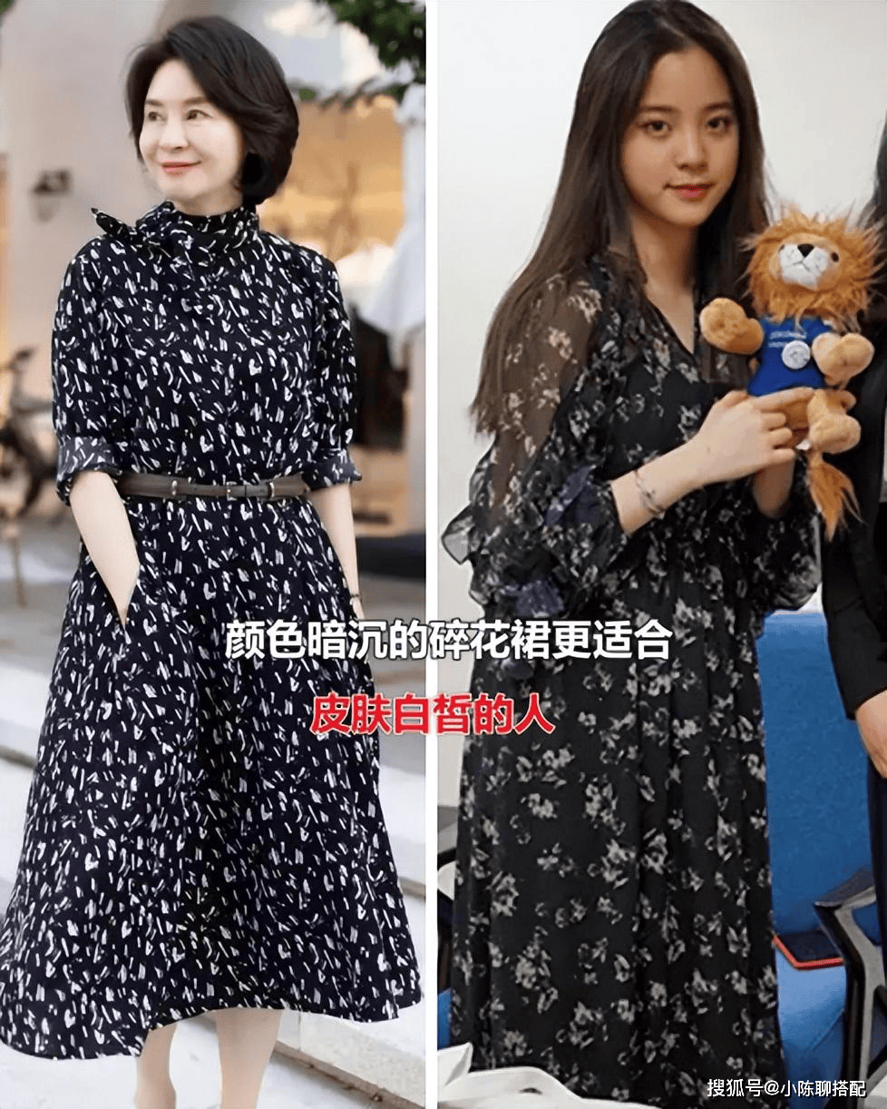 看看这组对比,同样的黑色印花服装,肤色白皙的中老年和肤色暗沉的年轻人对比,是不是右边反而更有年龄感?