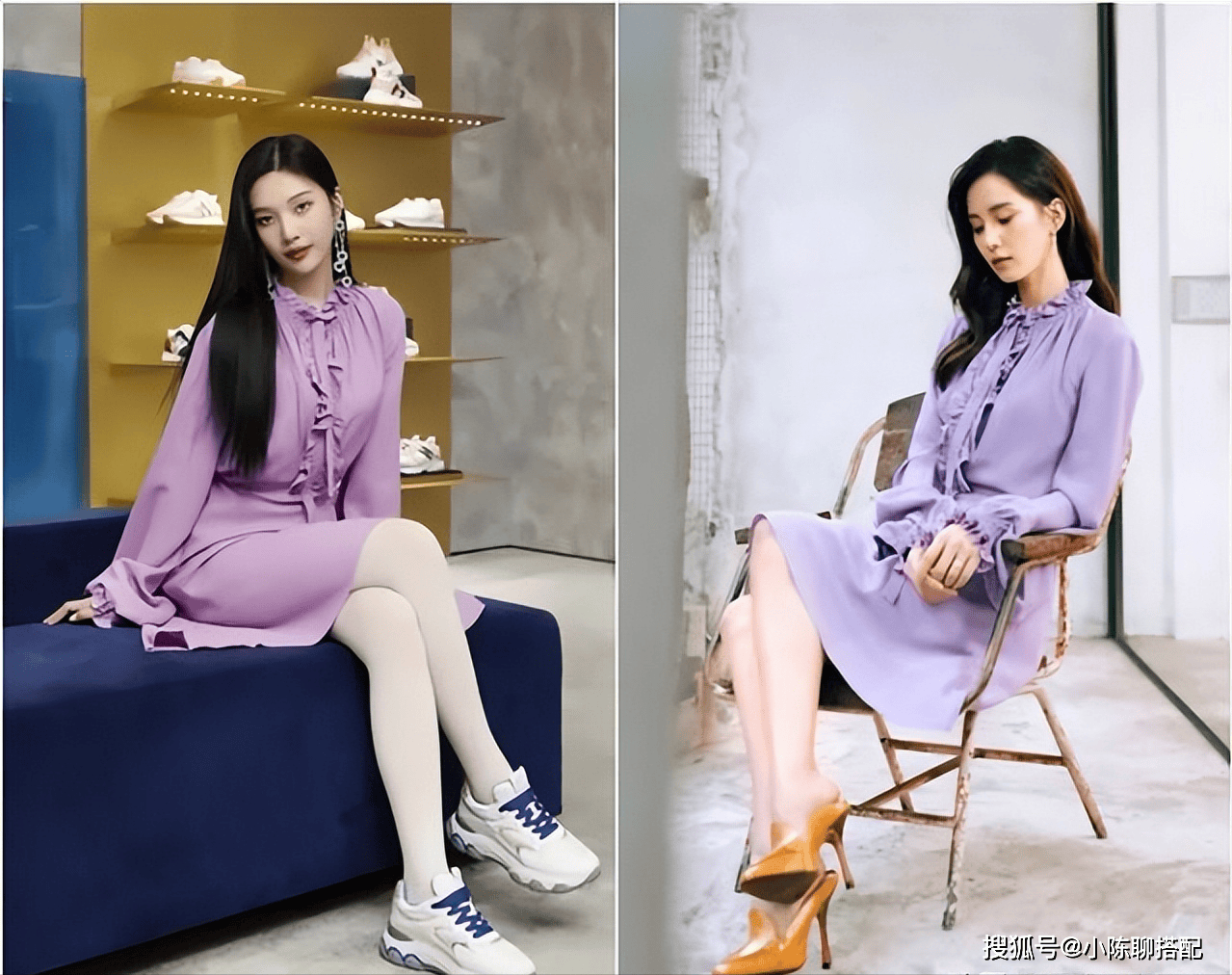 若是上面这一组搭配还不能看出其中的差距,那么这一组对比就更明显了。同样身材颜值长相不差的女明星,且穿同一条裙子,搭配运动鞋和气质鞋,穿搭美感完全就不一样了。