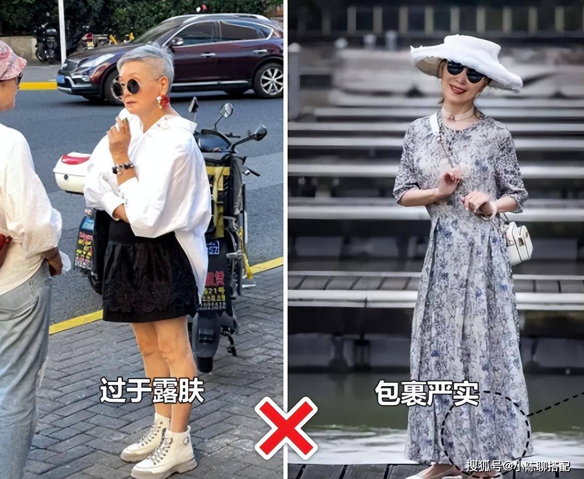 我们经常说裙子不能短于膝、不要选超短裤等,这些露肤度过高的款式日常穿搭不方便不说,也容易暴露老态。而包裹性过强的服装,不仅不遮身形还更暴露缺点。向从头到脚都包裹严实的服装,让整体看上去很显邋遢臃肿,还非常压身高。