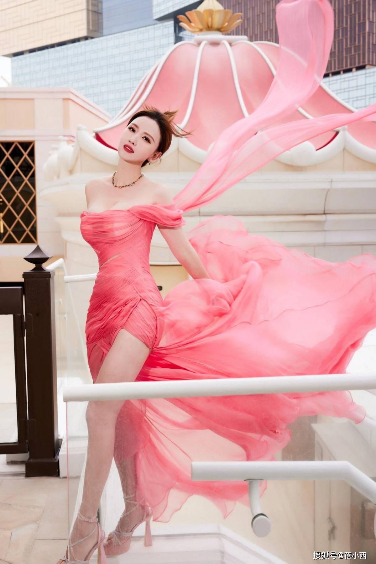 张萌的个子与其它女星相比,不算低,更别说和普通女生比了。即便如此,依旧撑不起长至地面的裙摆,因此,她搭配了一双鞋跟较高的高跟鞋,显高的同时,又提气质。