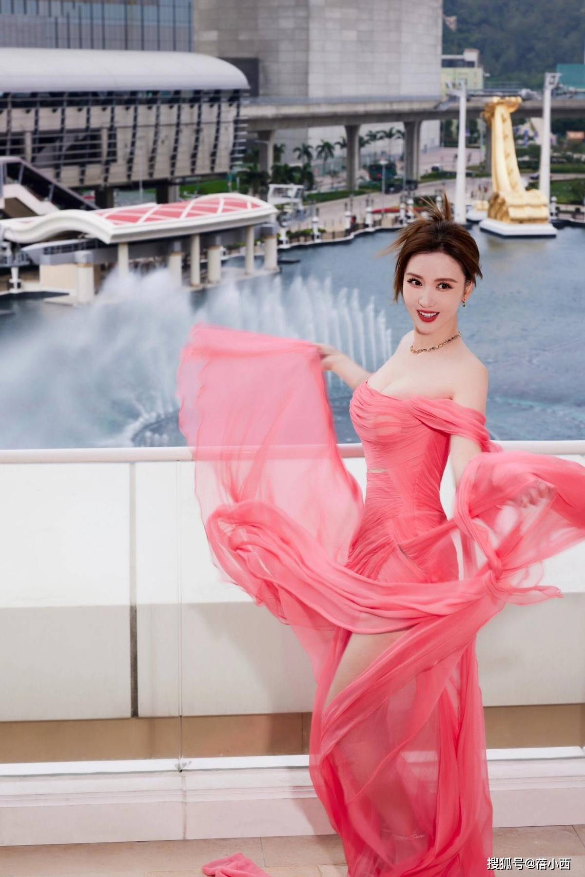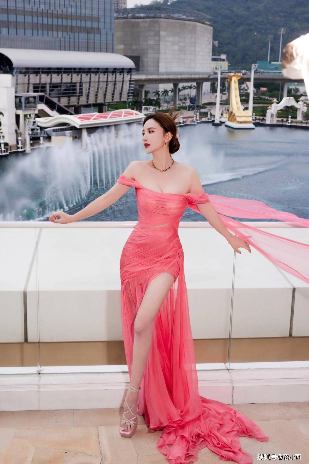 像这身粉色抹胸长裙造型,同样让我们受益匪浅。尤其是腰间的收腰+褶皱设计,不但勾勒出纤纤细腰,还起到优化身材比例的效果。