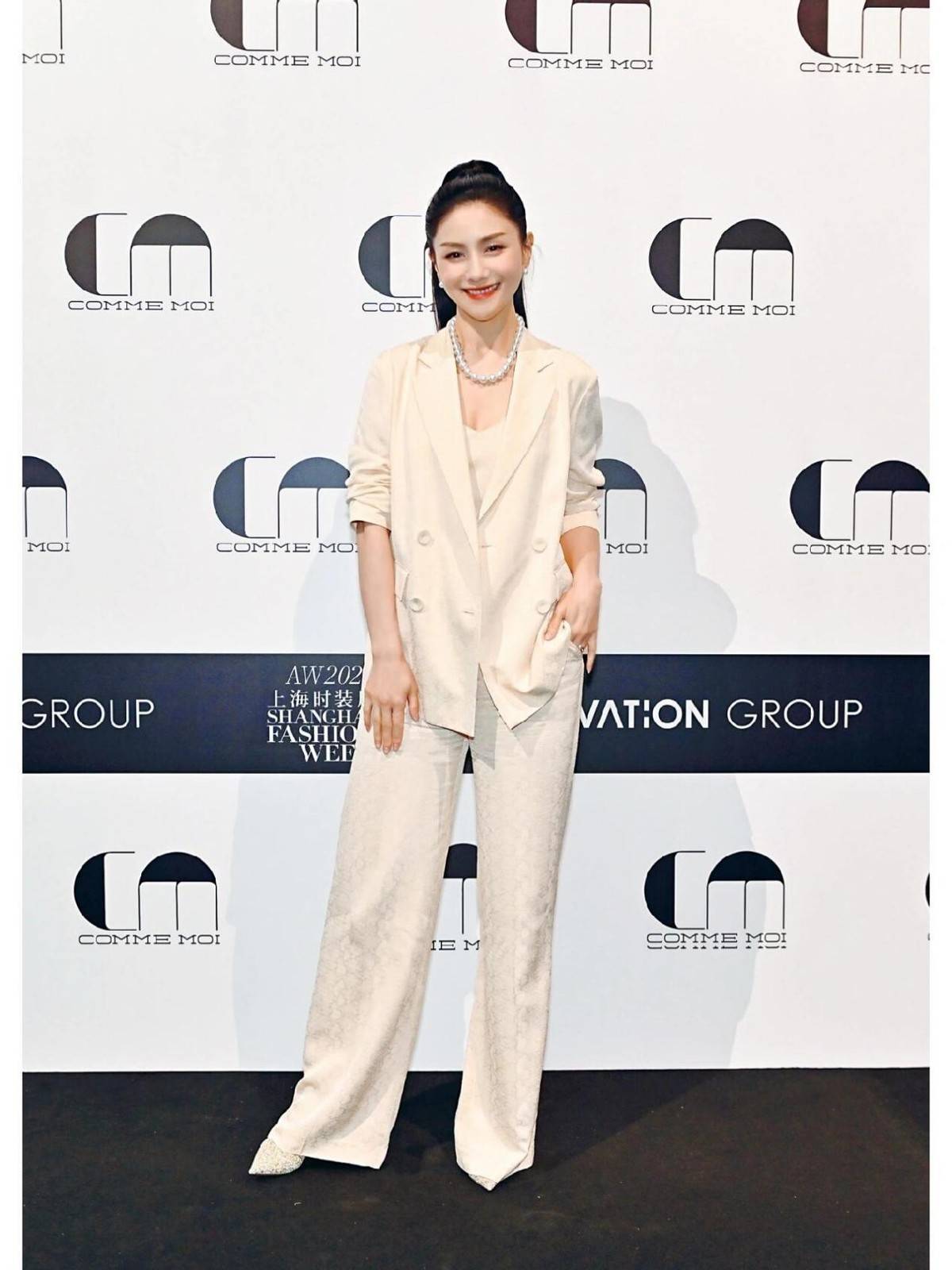 米色西装套装搭配高马尾