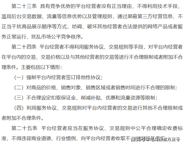 其中第二十五条要求平台经营者应当在服务协议、交易规则中公平合理确定收费标准,不得违背商业道德、行业惯例,向平台内经营者收取不合理的服务费用。