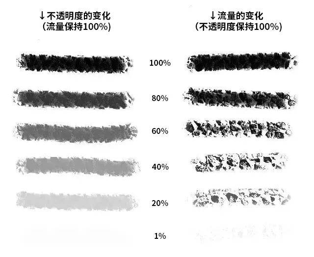不透明度: 相当于墨水的浓淡,数值越小颜色越淡、越透明。