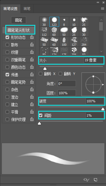 选择圆头笔,,选择,大小设置为19像素,硬度为100%,间距为1%。