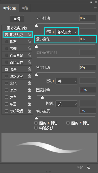 选择,里面选择钢笔压力,然后选取最小直径为0%。最小直径为0%时,能用笔的力度轻重来控制颜色的深浅,线条的粗细,慢慢地过渡均匀。