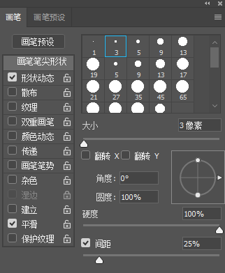画笔笔尖形状:主要分为大小、硬度和间距。